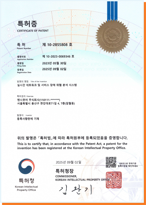 IT기업 엔시큐어(대표 문성준)는 이달 17일, 실시간 네트워크 및 서비스 장애 위협 분석 시스템에 대한 특허(제10-2855808호)를 취득했다고 밝혔다. 이번 특허는 네트워크 패킷을 정밀하게 분석해 서비스 상태와 장애 요인을 실시간으로 파악할 수 있는 기술이다.