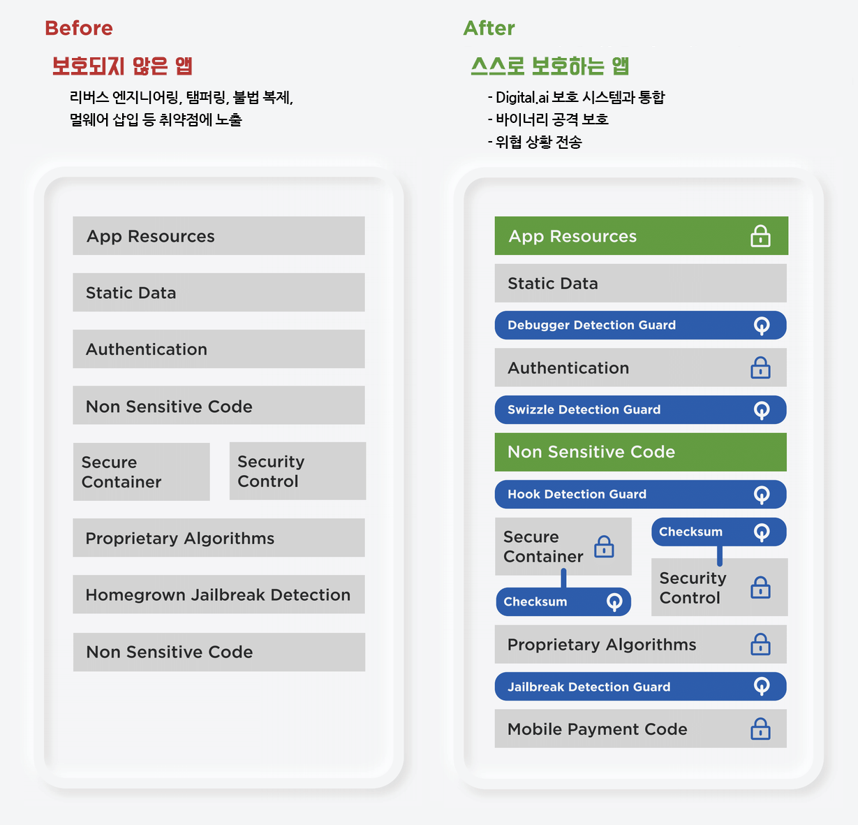 모바일 앱에는 기존의 솔루션으로 해결할 수 없는 고유한 취약점이 많습니다. Digital.ai Application Protection Guards를 사용하면 금융 기관은 수많은 취약점을 기술적으로 안전하게 해결하여 위반을 방지하고 규정을 준수할 수 있습니다. 가드는 다음과 같은 고유한 앱 보안 기능을 제공합니다.