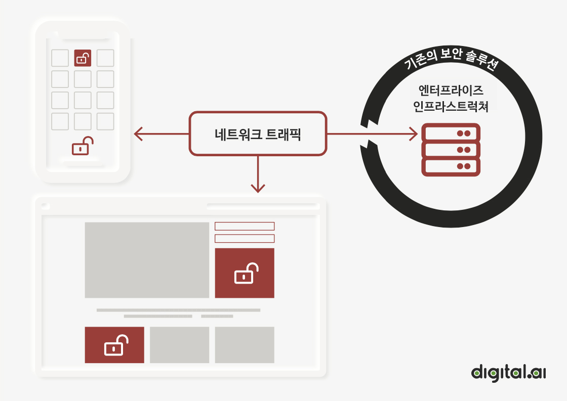 * 탐지 및 피드백 루프 - 실시간 위협 데이터는 진행 중인 공격을 사전에 경고합니다. 위협 데이터는 개발 시 피드백 자료로 활용되어 앱 보호 방법을 개선합니다.
